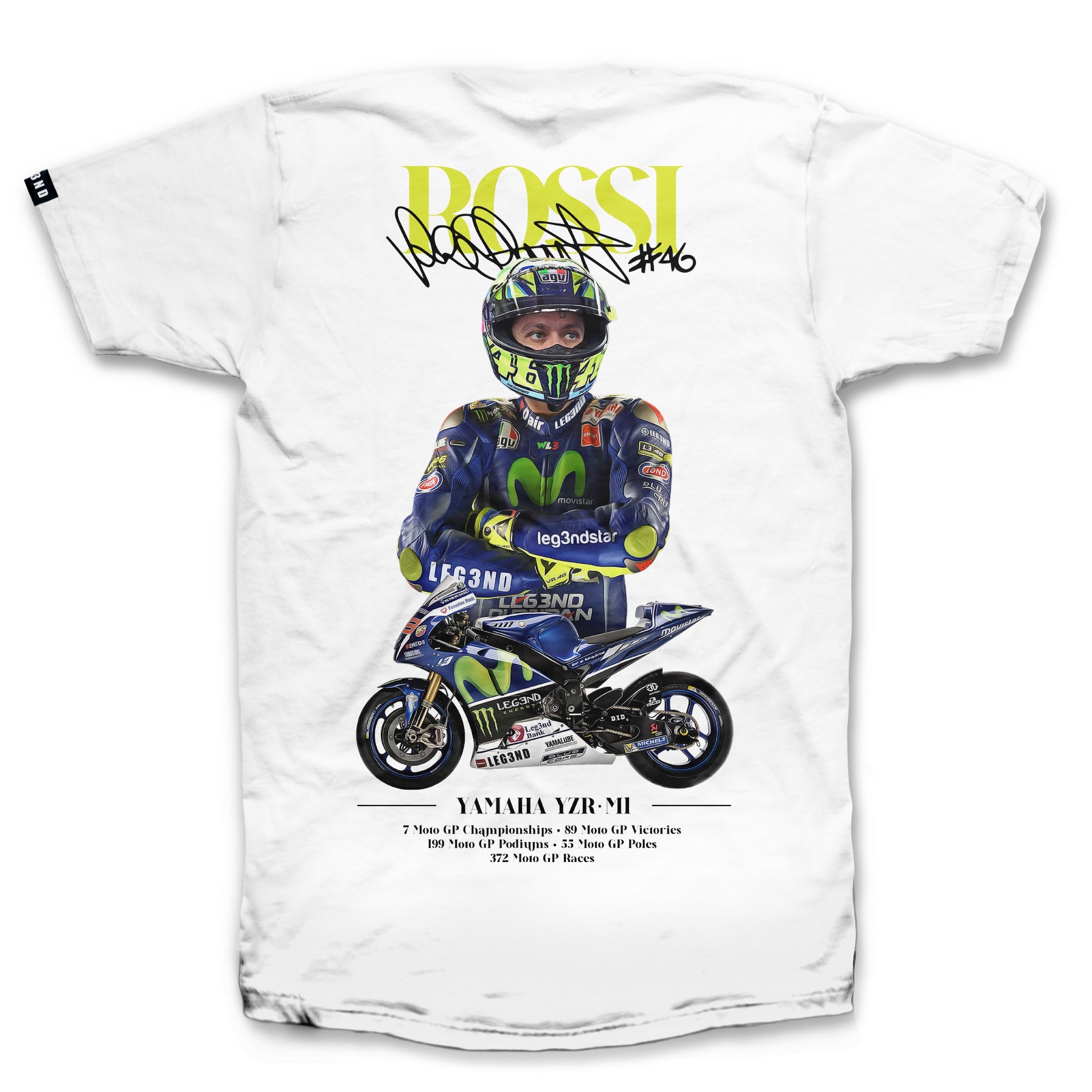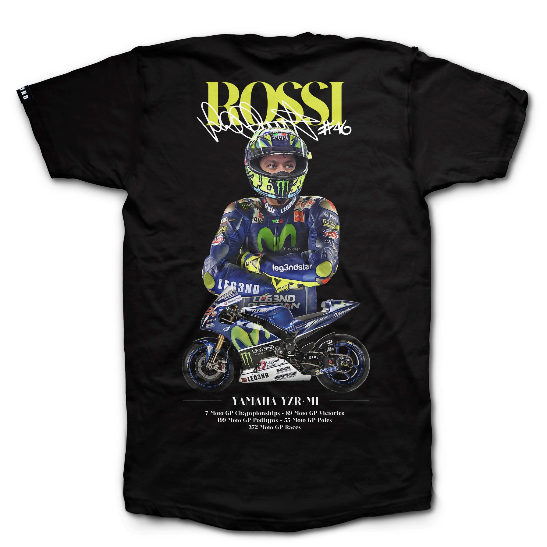 Tipografía: La palabra "ROSSI" coronando el diseño en su característico color amarillo flúor, superpuesta con una réplica de su firma y el "#46".
