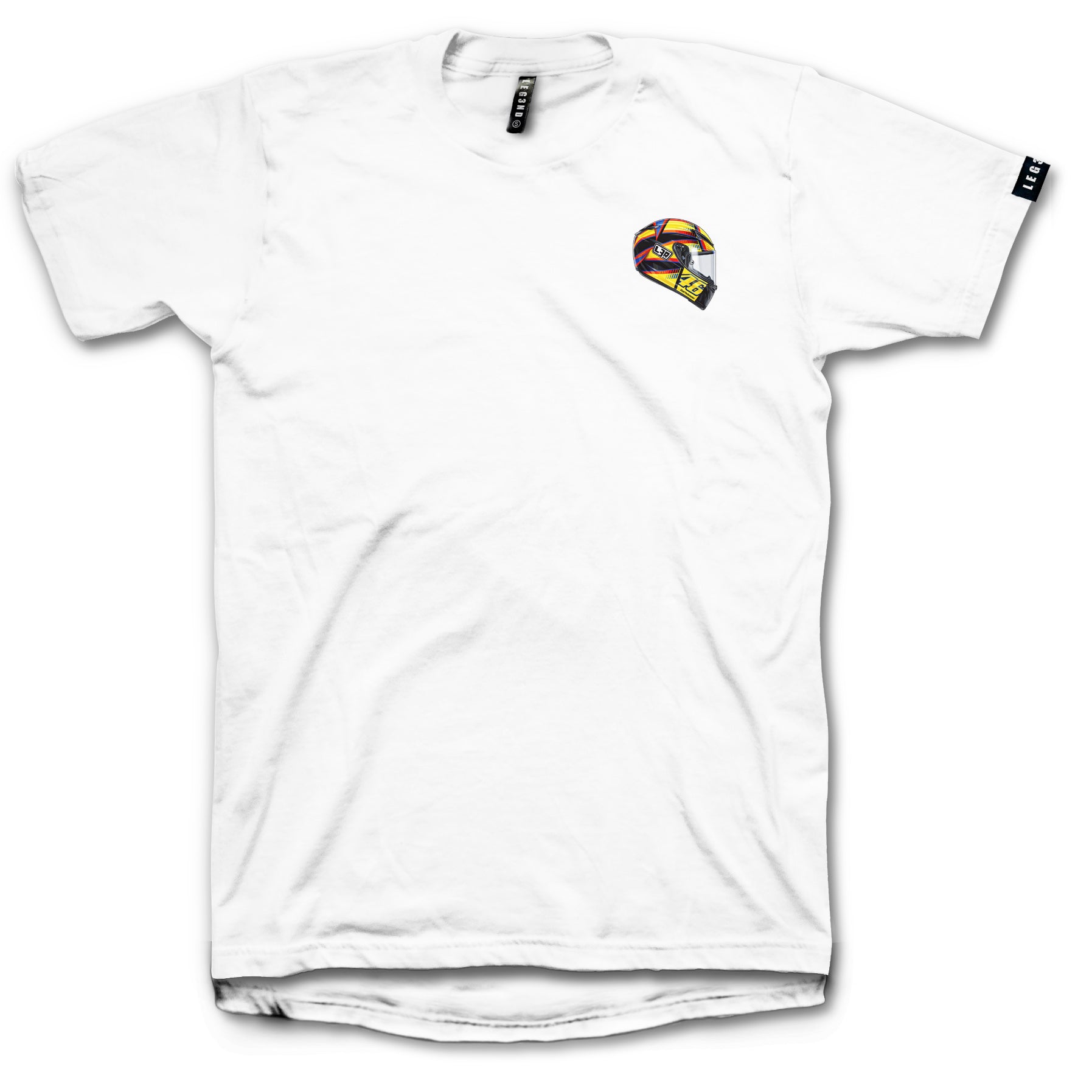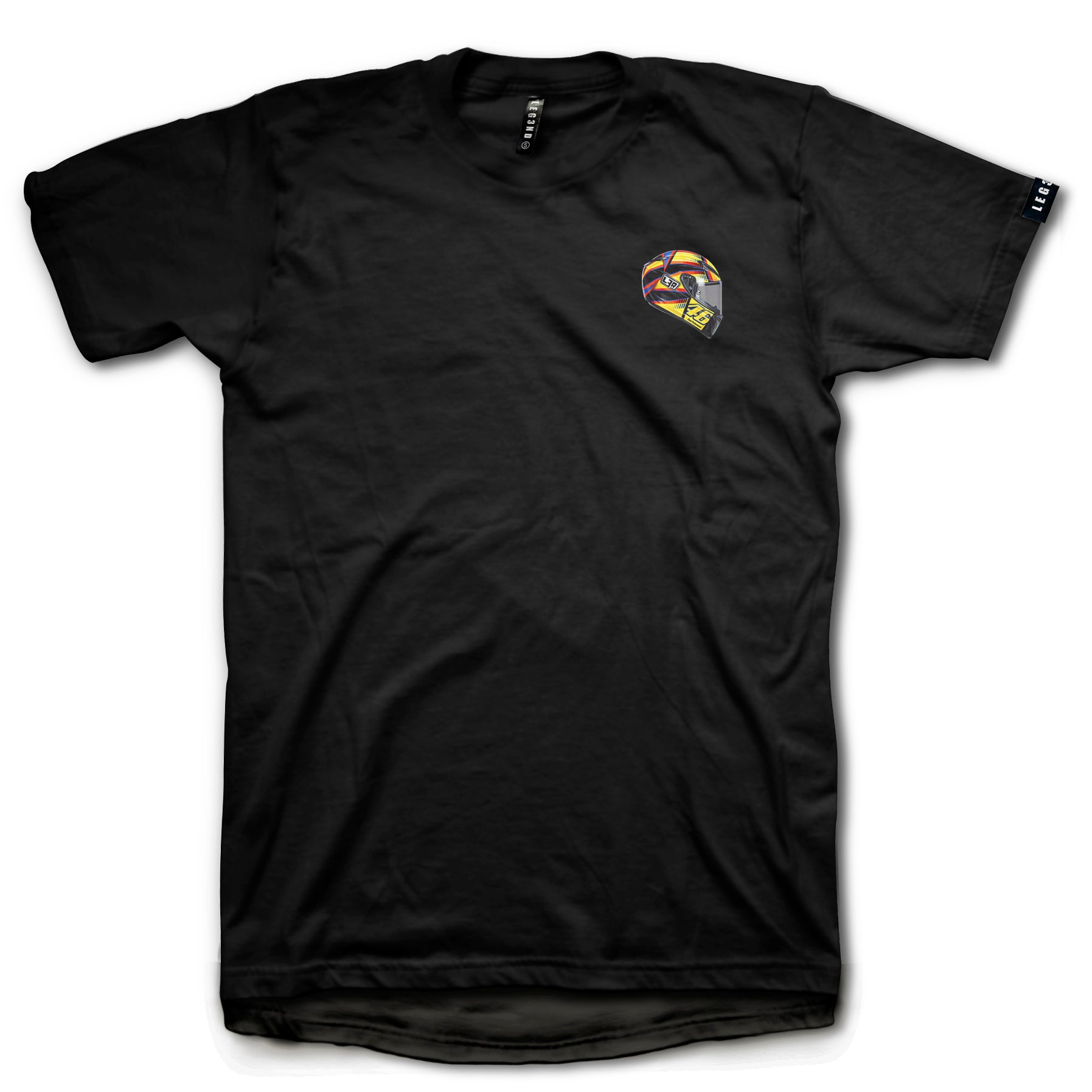 Pecho izquierdo: Ilustración a todo color del icónico casco de Valentino Rossi, destacando el inconfundible número 46 y sus clásicos tonos amarillo y azul.